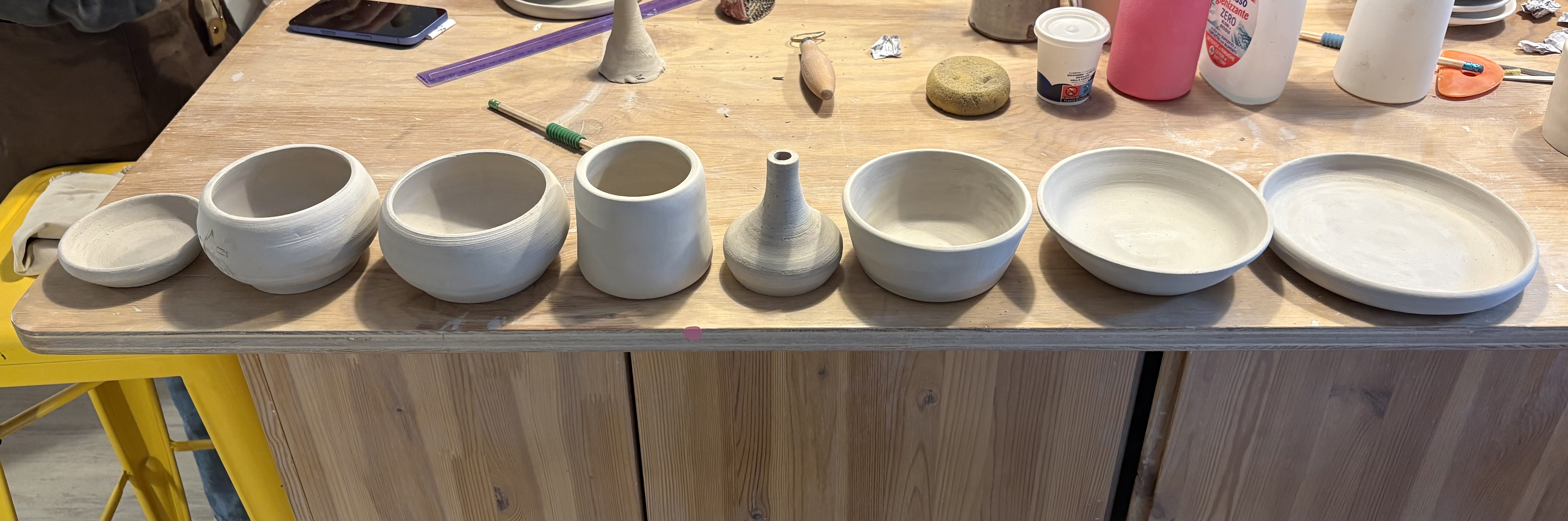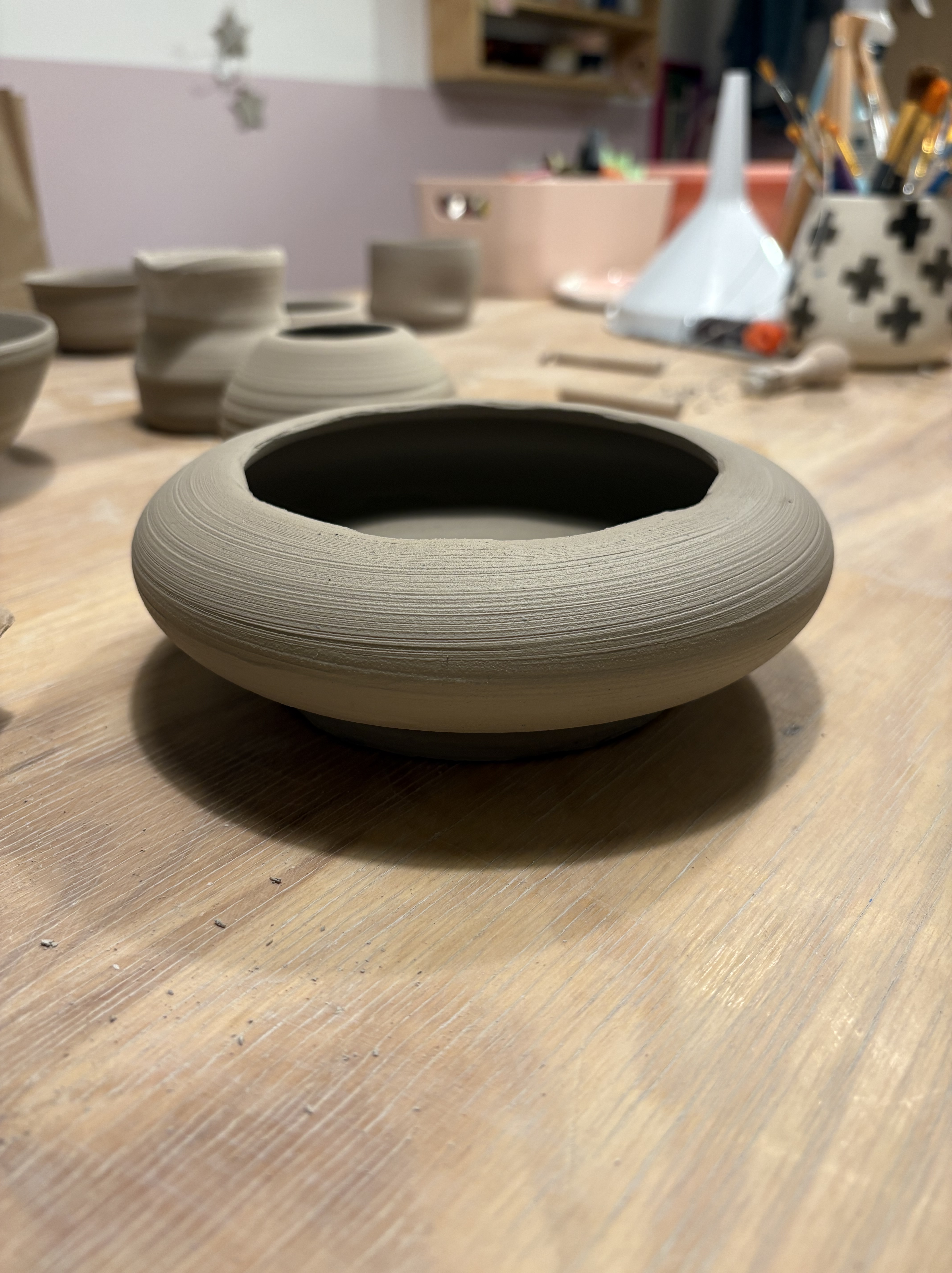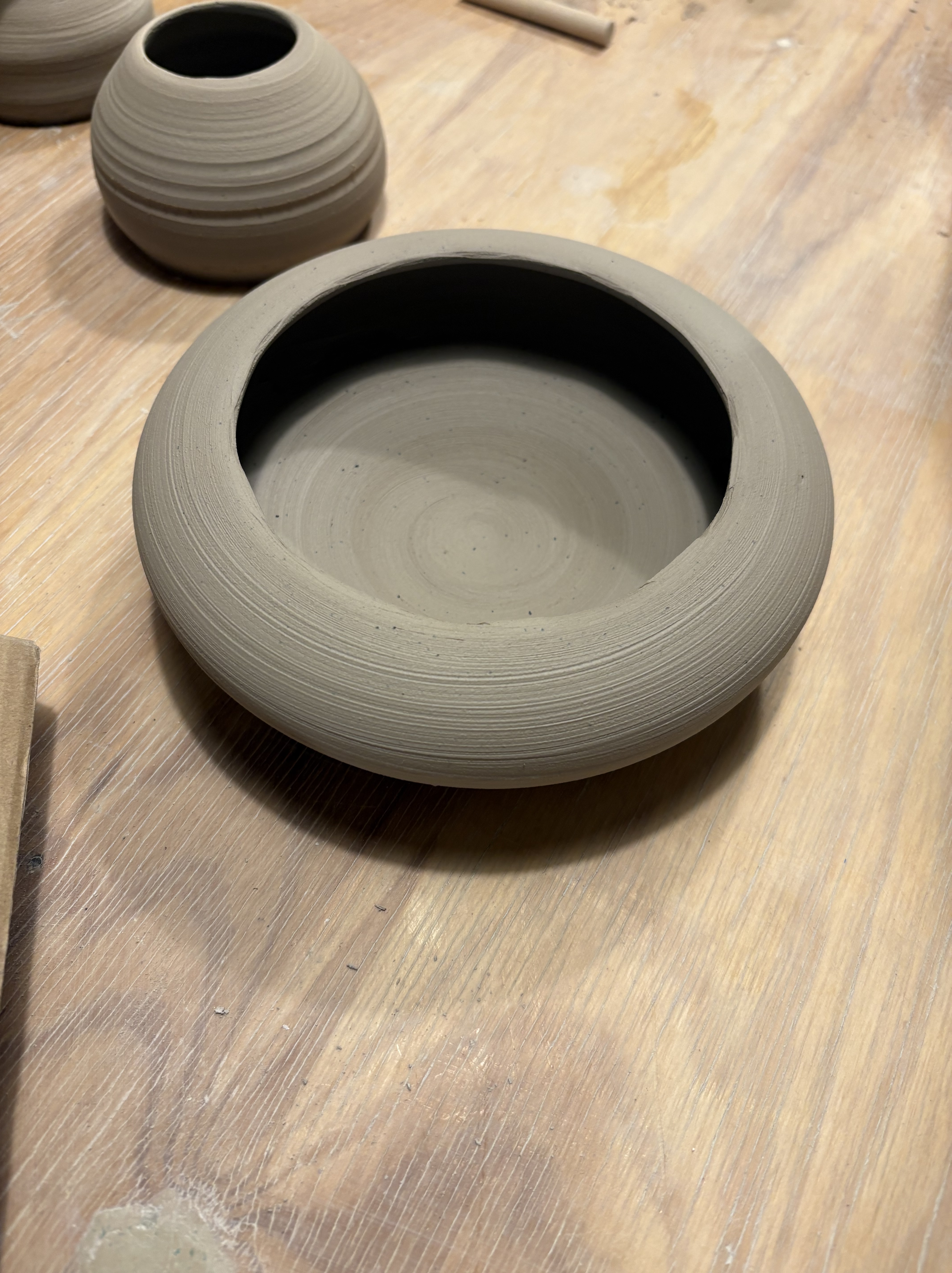 Ogni nuova forma è una sfida diversa: cambiano i gesti, cambiano le pressioni, cambia il modo in cui l’argilla risponde. Verso la fine iniziamo a lavorare su bowl sempre più tonde, quasi chiuse, che sembrano voler tornare a essere sfere. Oggetti che chiedono delicatezza e decisione allo stesso tempo.