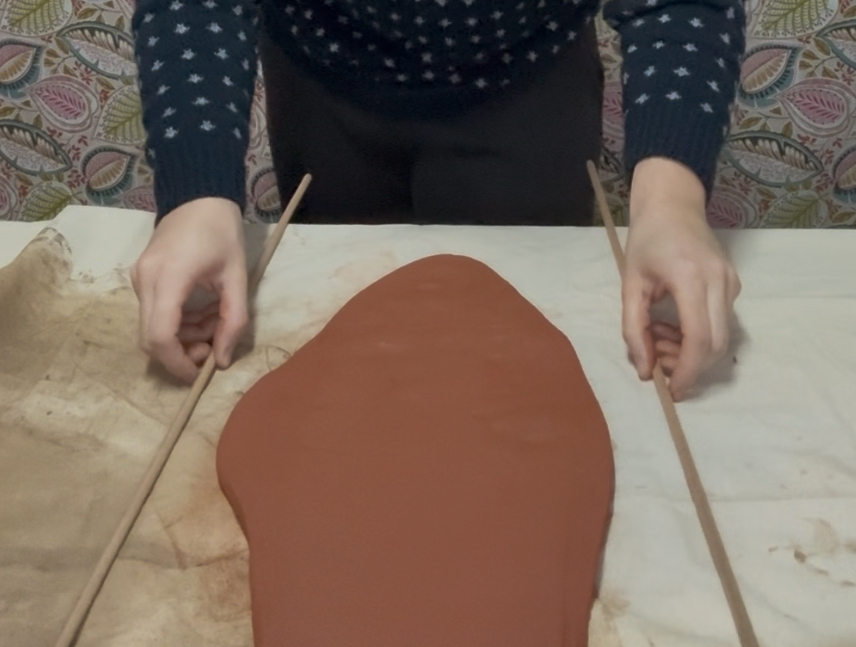 Tutto comincia da una lastra di argilla color pan di zenzero, stesa con calma fino a raggiungere uno spessore di circa 6–7 millimetri. È uno spessore che mi permette di mantenere solidità senza perdere delicatezza, e che restituisce al tatto una sensazione piena, rassicurante.